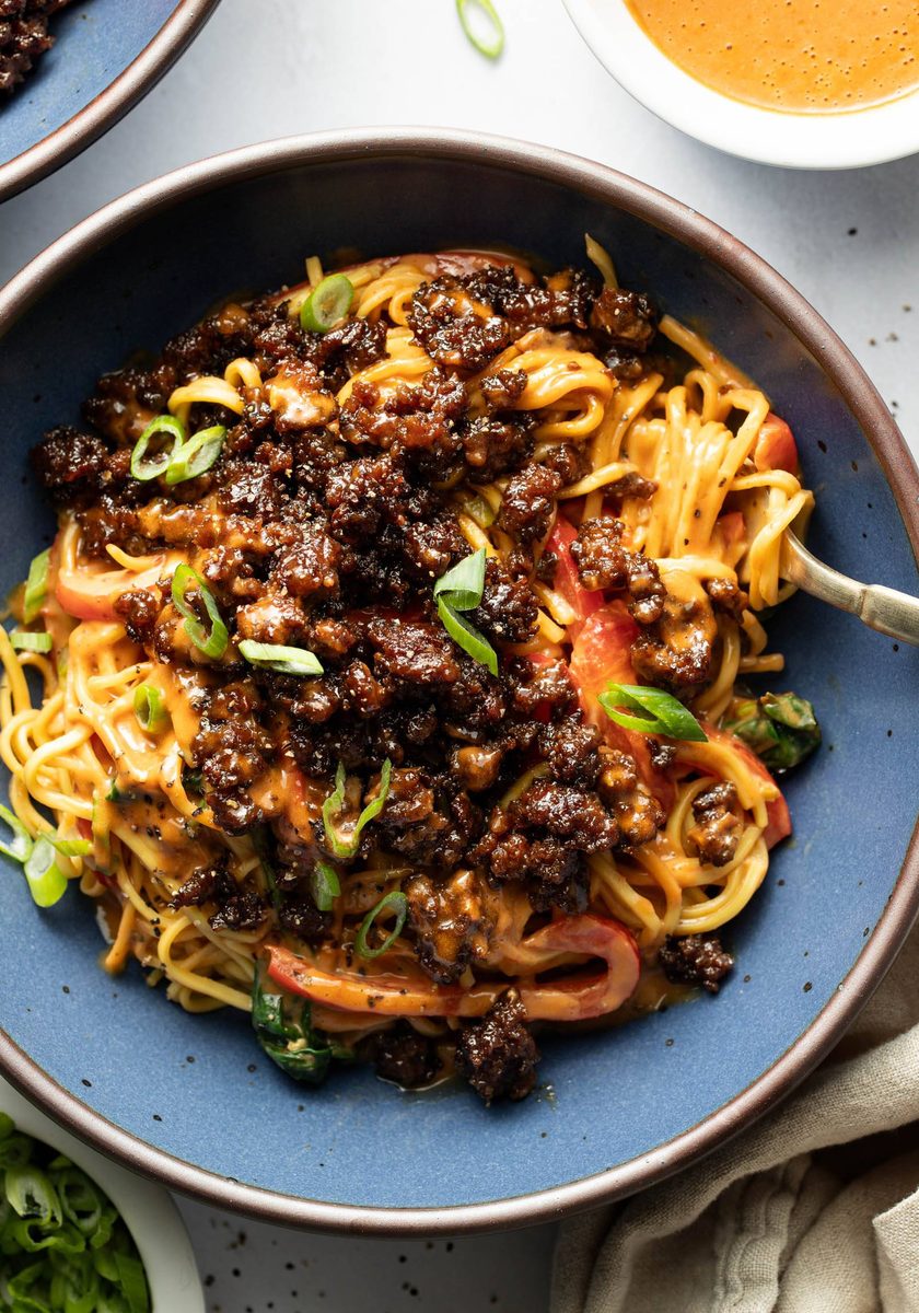 Caramelized ground beef atop a tangle of creamy peanut noodles and veggies! The best weeknight dinner!