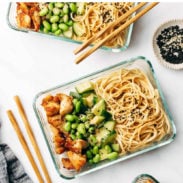 - Bowls: Divide noodles, edamame, cucumber, and chicken into containers. Drizzle with a little extra sauce and sprinkle with sesame seeds. Voila! Store in the fridge for 3-4 days. Eat hot or cold. Take a shot for the ‘gram cause this is your moment.