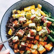 Ideas for bowl assembly: quinoa, rice, roasted sweet potatoes, green beans, corn, zucchini, tomatoes, mushrooms, spicy coleslaw (I just toss a bag of preshredded cabbage coleslaw mix with a little bit of mayo, salt, and Sriracha. Vegan mayo works, too!)