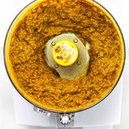 - Once the aromatics are finished in the oven, blend everything up in a food processor or a high-powered blender to form a yellow paste to your desired consistency. Smooth paste or something a lil’ more chunky? Both work! Boom! How simple is that?