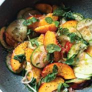 - Add peaches, mint leaves, and a drizzle of hot honey. Toss gently to combine.
