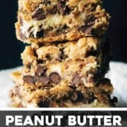 Peanut butter chocolate chip cookie cheesecake bars. I know it. The name is way too long. But I can’t think straight or see straight or do anything normal right now, except I can see the fridge, and I’m thinking there are maybe three bars left in there right now?