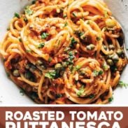 I love this twist on puttanesca. Roasting the tomatoes gives such a great roasty flavor that compliments the brininess of the capers. Overall a great dish!