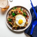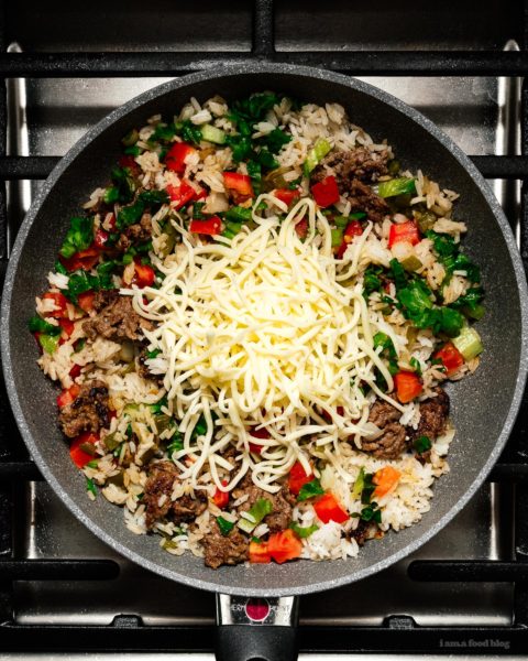 If the skillet is dry, add a bit of oil and then add the rice. Turn the heat up to high and fry, stirring occasionally until the rice is crispy and heated through. If you’re using rice from the fridge, it’s best to break it up with slightly wet hands before putting in the pan.