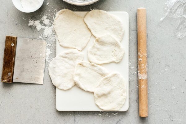 Lightly dust your work surface with flour. Divide the dough into 4-6 equal pieces and use a rolling pin to flatten and stretch out.