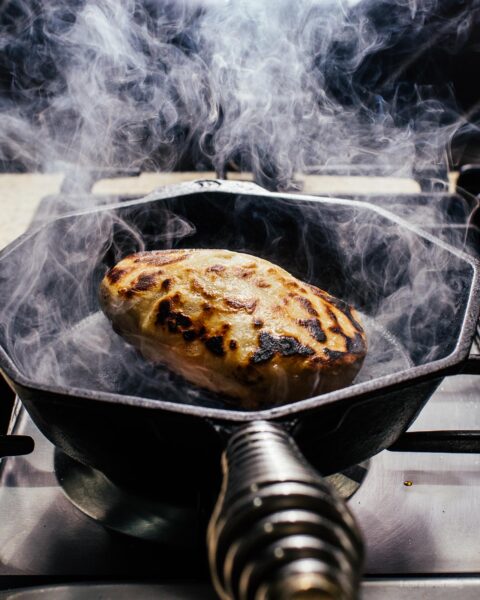 Lightly dust your work surface with flour. Divide the dough into 4 equal pieces. Use a rolling pin to flatten and stretch out, then place 1-2 tablespoons of shredded cheese in the middle. Pinch to enclose the cheese, then gently roll out again. If you’re having trouble rolling it out, let the balls of dough (with the cheese inside, rest, covered for 5-10 minutes)