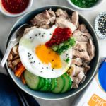 When the rice is done, fluff and place into a bowl. Top with the chicken, green onion oil, cucumbers, carrots, mushrooms, sambal oelek, and egg. Enjoy!