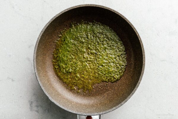 Heat the pesto in a non-stick skillet over medium heat.